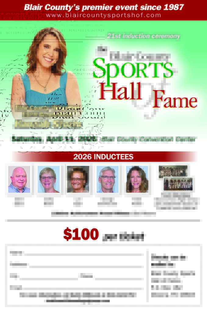 Tickets for the induction are priced at $100 and orders are now being taken and tickets will be mailed by March 20. Checks should be made out to the Blair County Sports Hall of Fame and mailed to P.O. Box 162, Altoona, Pa. 16603. Questions can be directed to Kathy Millward at (814) 312-4753 or [email protected].